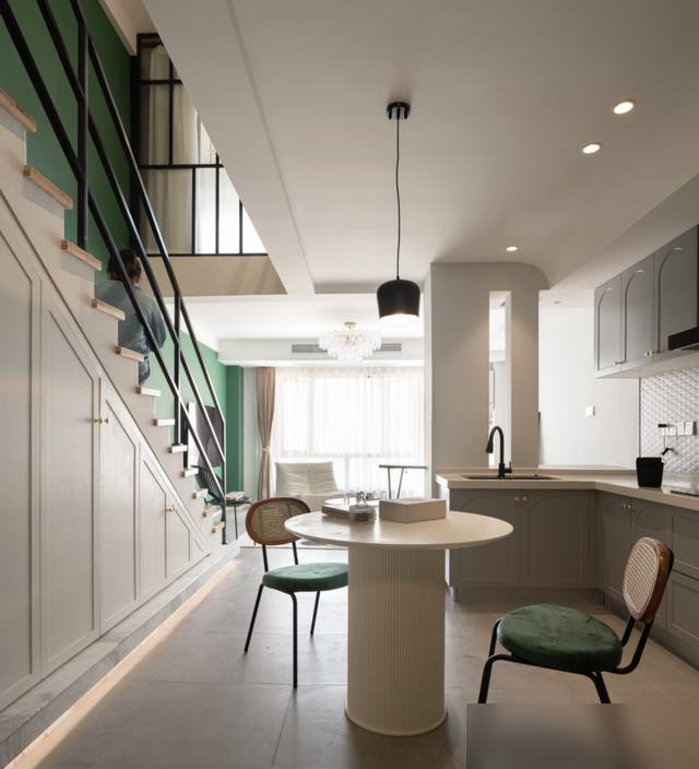 先说小空间最头疼的痛点:原始户型柱子多到像“空间分隔符”,二楼层高矮得直不起腰——这不是很多老破小/复式的通病吗?结果设计师一拆(不必要的墙全敲了)一合(客餐厨打通),瞬间把“挤得慌”变成“能打滚”。你想啊,平时一个人窝在客厅,视线能从沙发扫到厨房的灶台,连煮个泡面都像在“开放式剧场”里演戏,这种“通透感”比买大平层还爽!