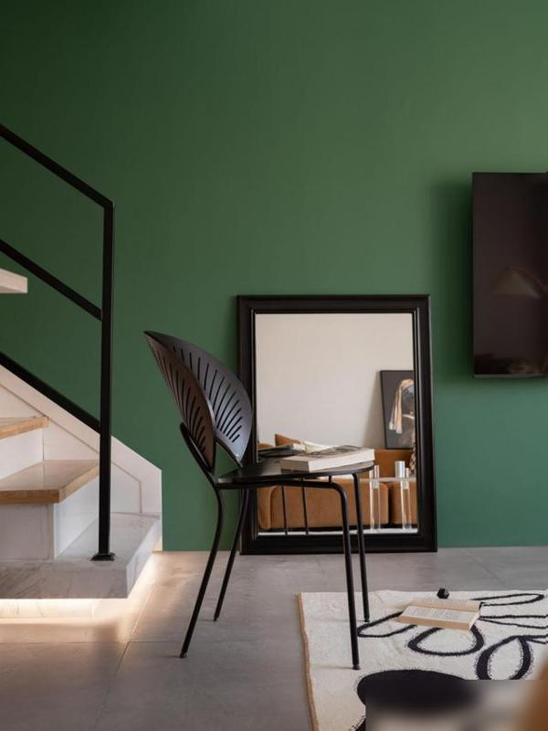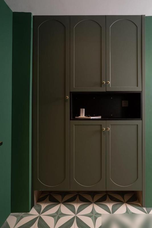 再说配色,墨绿居然成了“灵魂”——玄关的加厚鞋柜是墨绿,电视墙也是墨绿,连卫生间都飘着点墨绿的影子。不是那种扎眼的“原谅绿”,是像老钢笔水沉淀后的温润感,配门口的拼接瓷砖,进门瞬间像闯进90年代港片里的小公寓,复古但不陈旧,精致却不矫情。现在年轻人不就爱这种“有故事感”的颜色吗?比千篇一律的“高级灰”有温度多了!