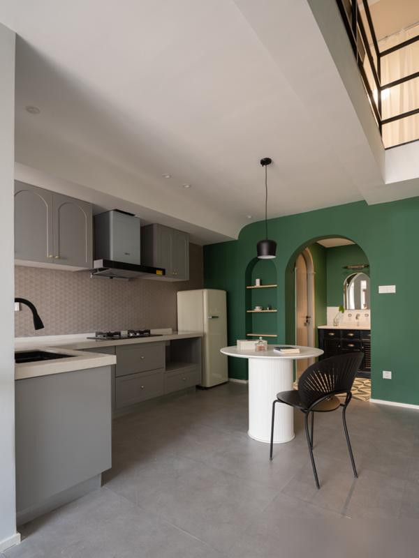 最戳我的是“把仪式感揉进功能里”——厨房改成开放式就算了,还做了个拱形壁龛!本来厨房要装调料瓶、碗碟,壁龛一挖,既能藏东西又像个“mini展示柜”,摆两瓶红酒、几个陶碗,煮面的时候瞥一眼,连烟火气都带着文艺感。还有餐厅的圆形餐桌,就摆两张藤编椅——明明只有一个人吃,但偏要选“轻盈款”,不是为了撑场面,是“就算一个人,也要好好吃饭”的倔强,这种“不将就”的态度,谁看了不心动?
